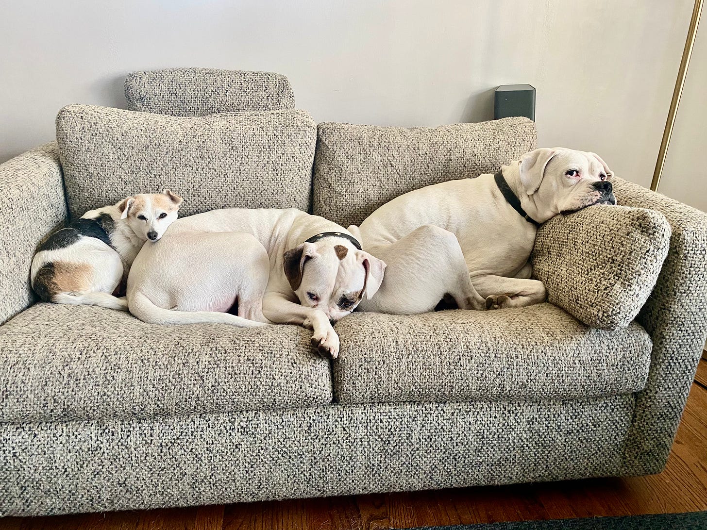 Therapy helps. Medication helps. Insight helps. But sometimes what keeps you sane is a warm body next to you on the couch. Whenever life hands you a shitburger in the form of loss, change or grief, a dog will help you eat it. Dogs don’t require you talk through your problems but if you’re in the mood, they’ll listen with the rapt attention of a client-centered therapist offering unconditional positive regard.