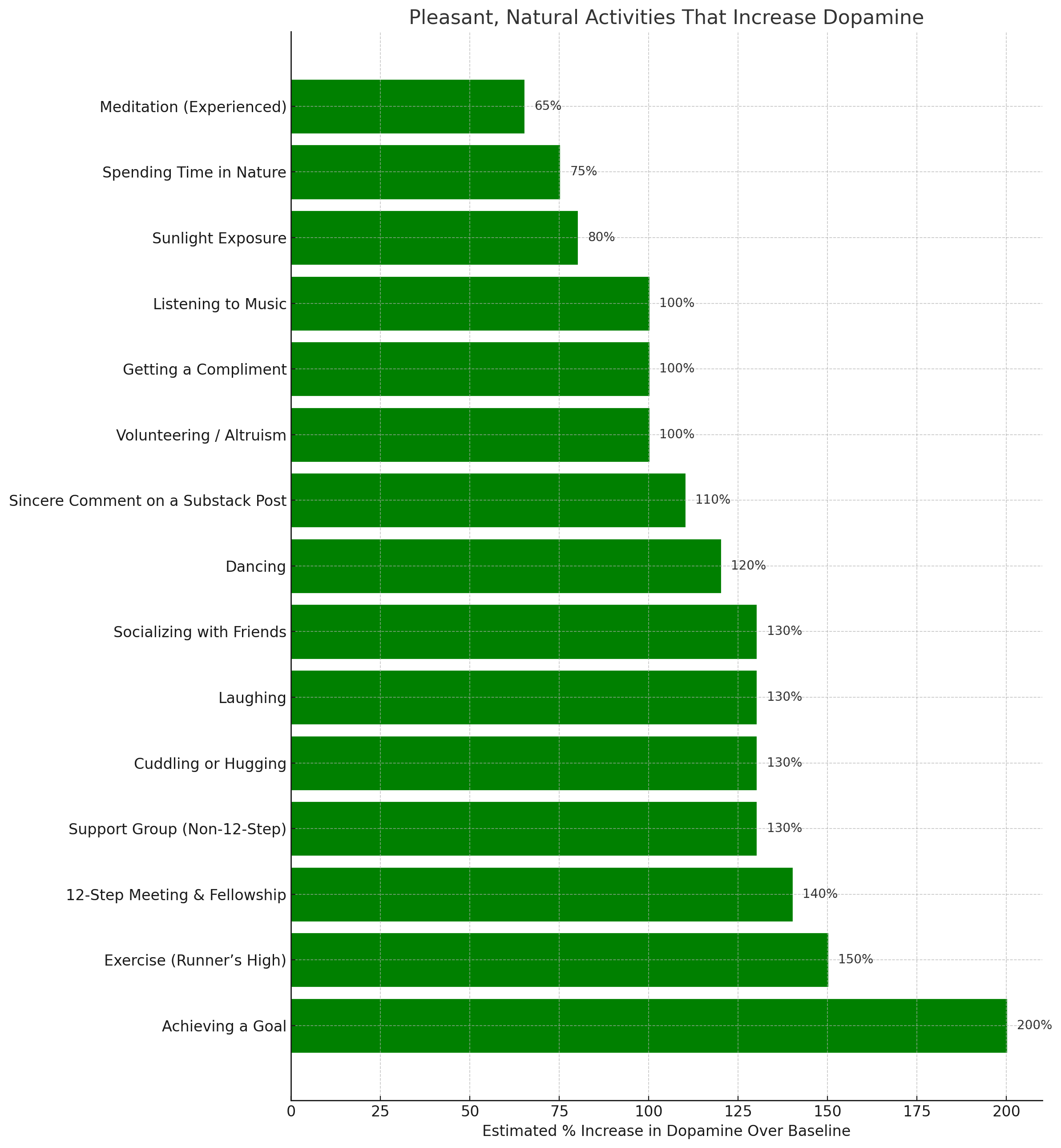 Everyone has a dopamine baseline humming along. This is a neutral state where you're neither bored nor interested. Nothing in particular is going on in your brain. It's kind of imaginary because I don't know about you but there's always something clicking along in my brain. But just try to picture it as a temporary, even state so we can compare the percentage over baseline. Too little dopamine circulating around and nothing is interesting to you - you're apathetic and don't care. Too much wires you up and makes everything salient. You'll get impulsive and manic with overstimulation. For comparison, let's look at substances or activities that give you a boost of dopamine over baseline.