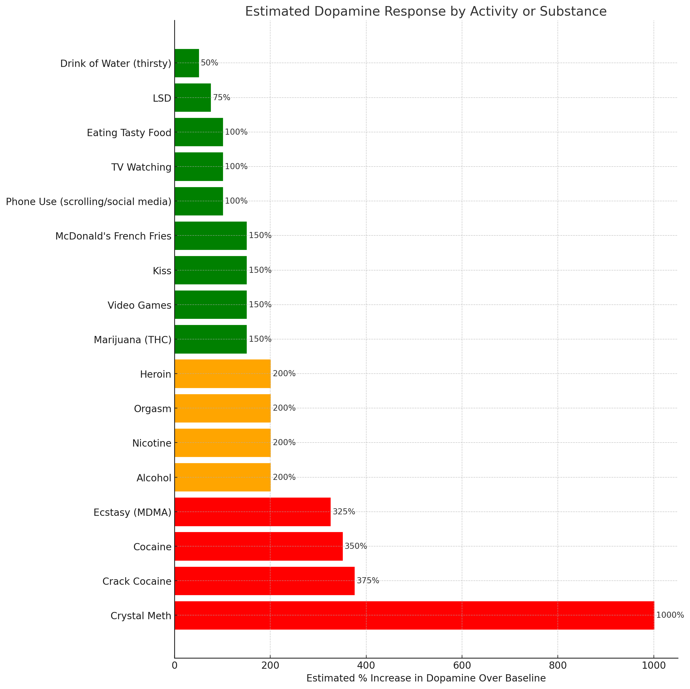 When you're thirsty, a cool drink of water increases dopamine 50% over baseline. An orgasm (200%) just barely inches out McDonald's french fries and weed (both 150%). . If you're looking to bump up the dopamine, LSD (75%) isn't going to do it; you're better off scrolling on your phone or watching tv (both 100% each) or playing video games (150%).